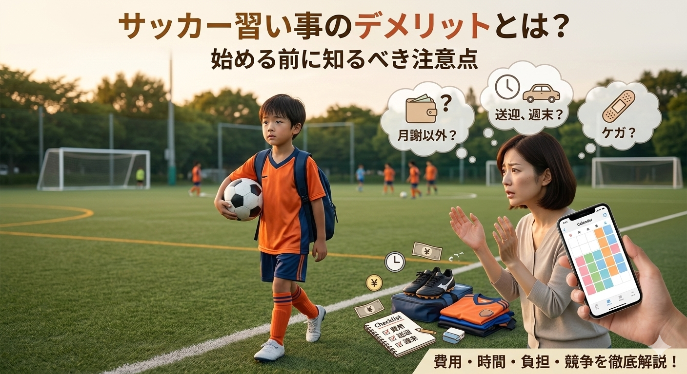 この記事では、サッカー習い事のデメリットを中心に、始める前に知っておきたい注意点を整理します。初心者の保護者でも判断しやすいように、費用面・時間面・子どもの負担・家庭への影響という視点からわかりやすく解説します。最後には、サッカーが向いている家庭と慎重に考えたい家庭の違い、よくある質問もまとめています。